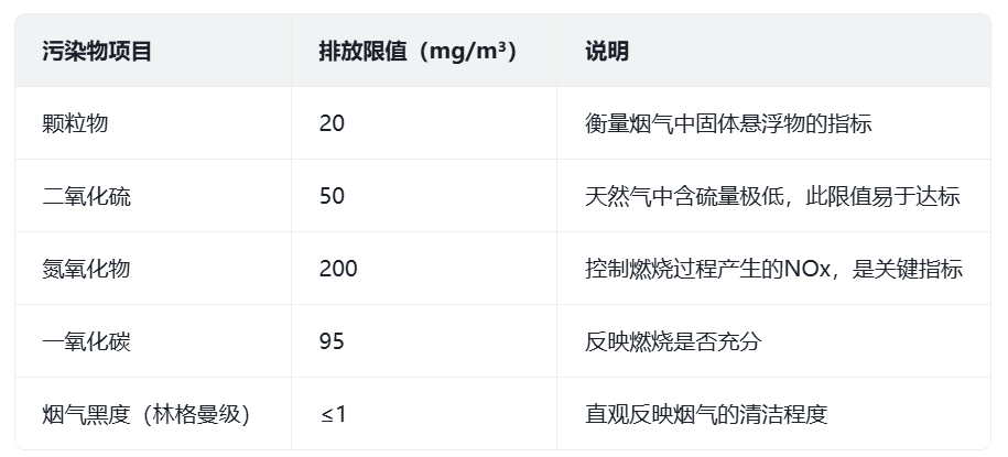 對于以天然氣為燃料的新建燃氣鍋爐,標準規定的主要污染物排放限值如下: