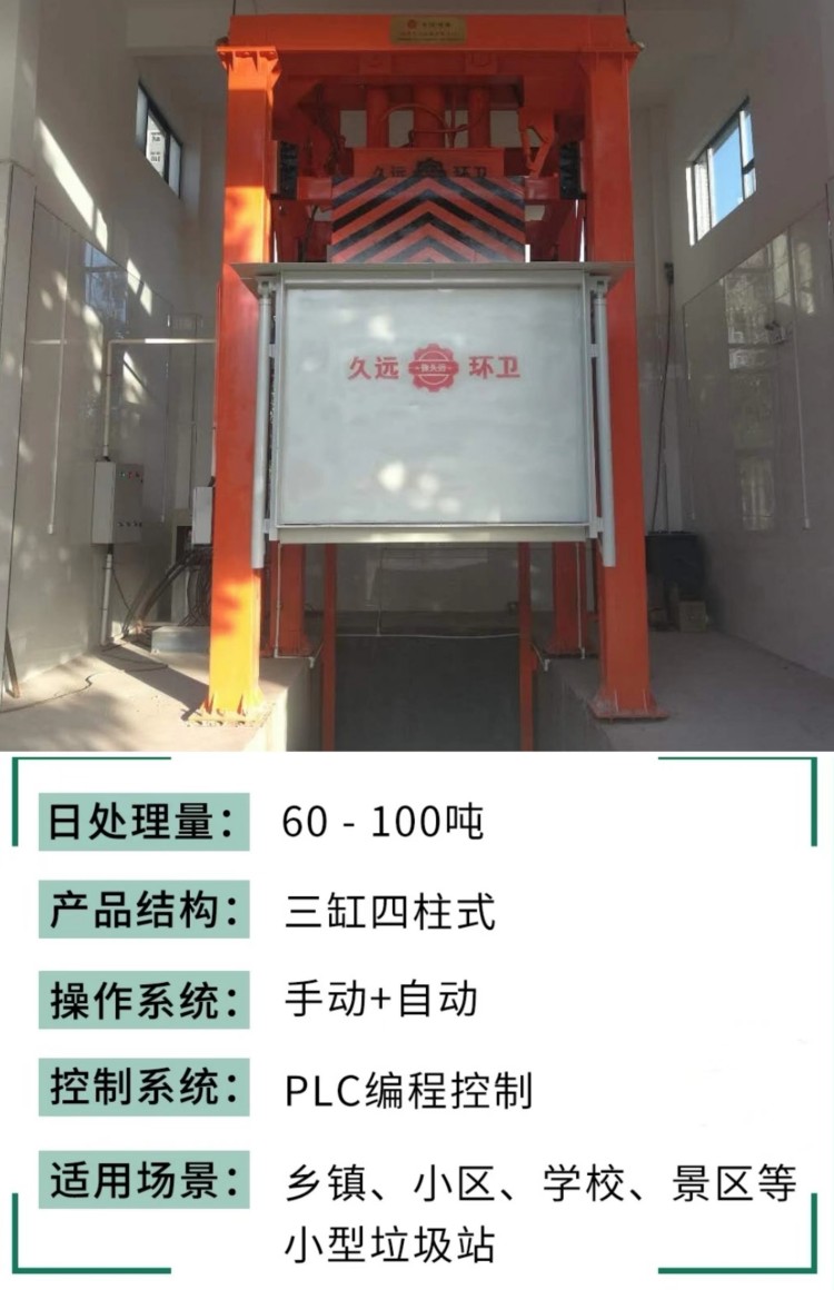 垂直式垃圾壓縮設備在原立式壓縮站的基礎上將單杠直壓變為三缸同壓,大大降低了房屋高度,科技含量高;采用12只液壓油缸控制運行,操作更加靈活簡便,性能穩定。該產品適用于城鎮生活垃圾的儲存、壓縮和轉運,通常可設置在靠近街道及居民生活小區內,是當今生活垃圾處理的理想設備。