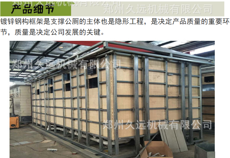 1、房體結構: 采用輕鋼龍骨結構,鋼材全部使用國家標準鍍鋅鋼材。根據房體的大小特選用國標方管(50-100)焊接而成。鍍鋅管厚度為2.8mm,方管經過除銹后進行鍍鋅、防腐處理。這樣就會延長廁所使用壽命。